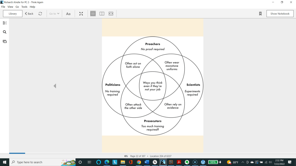 The following excerpts are taken from Chapter 1 of Adam Grant’s book, Think Again: The Power of Knowing What You Don’t Know. The title of this chapter is “A Preacher, a Prosecutor, a Politician, and a Scientist Walk into Your Mind.” Since these are all Adam’s words, I’ve omitted quotation marks. However, emphasis is my own.